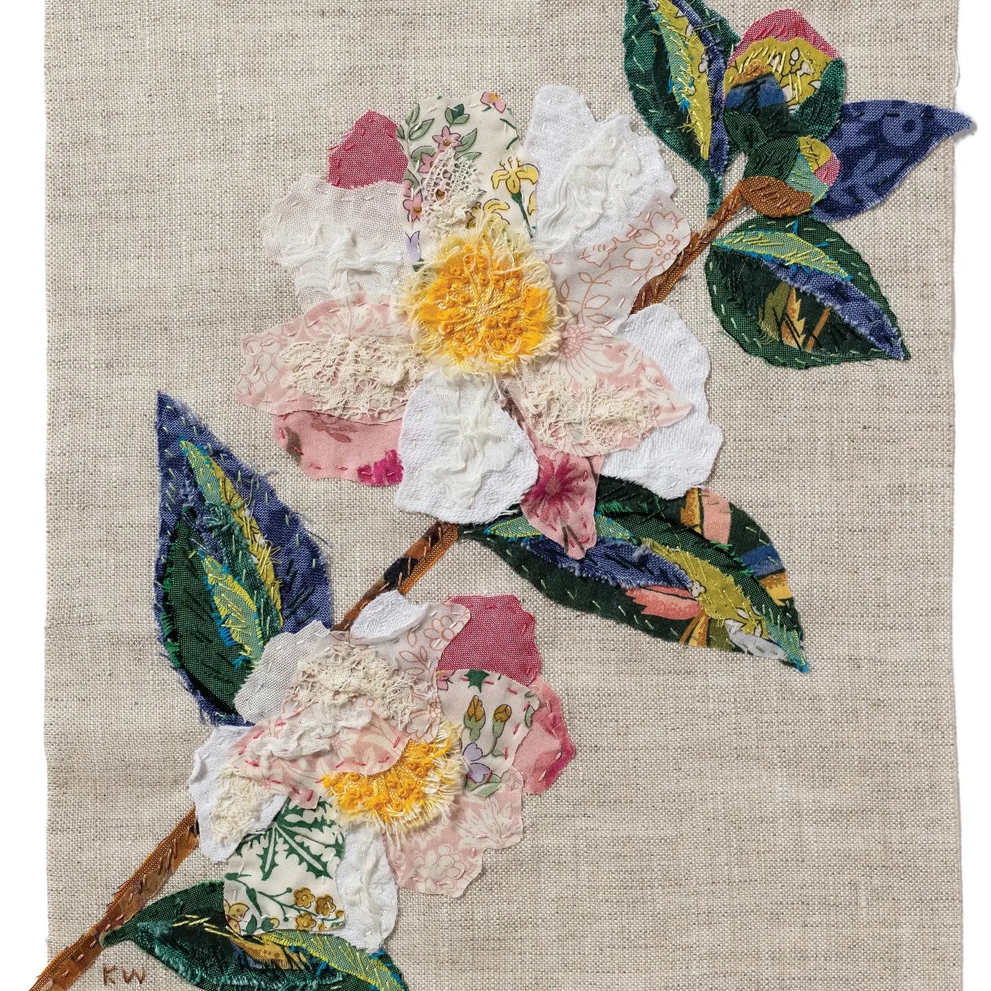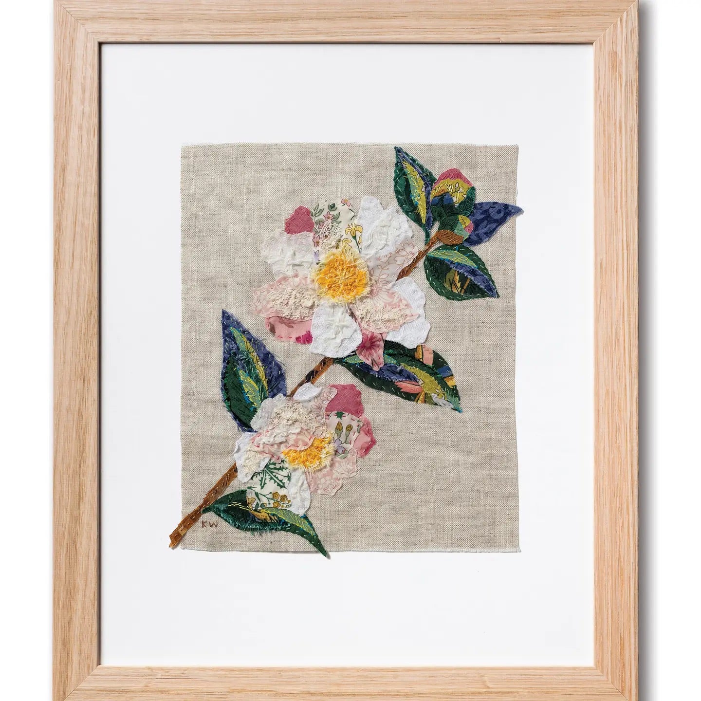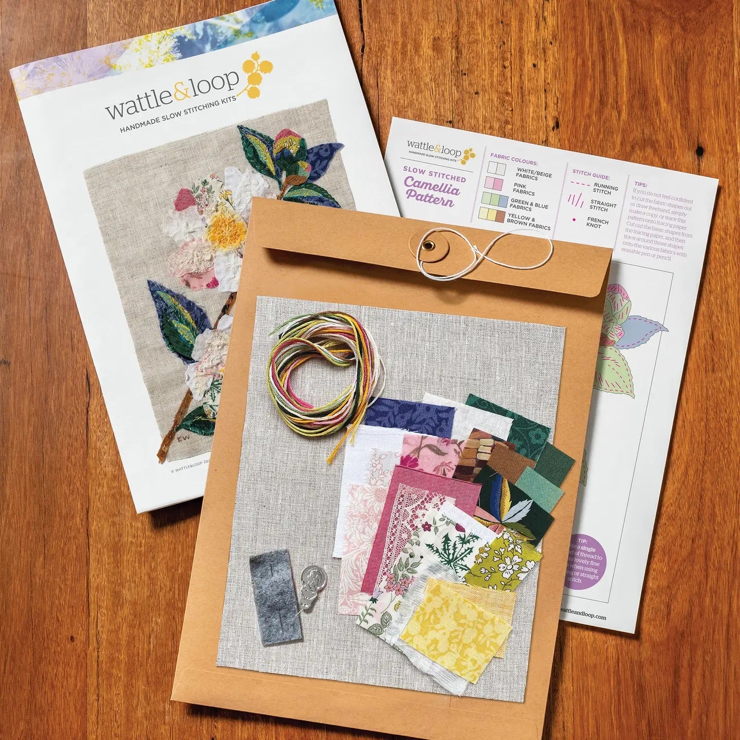 The Camellia kit includes a beautiful natural linen background to work on. For the Camellia flowers, buds and leaves we’ve included a fabulous selection of textured, vintage whites and pinks, some very special new Liberty London Tana Lawn prints as well as vintage tulle and lace to add some extra texture and beauty. This kit has a unique colour palette with the inclusion of whites, pinks, blues, greens and chartreuse for an extra colour kick!