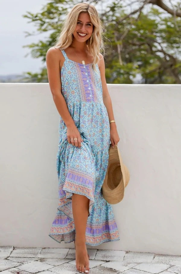 Sweet and irresistible, the Luna Sky Tiered Maxi Dress is the must-have strappy dress for the summer season. This floral dream has a super feminine silhouette with button bodice, thick straps, relaxed waist with double tiered frill border hem. Perfect for market days and balmy nights, you’ll feel effortlessly beautiful wherever you go. Product Description: - Button font with pin tuck details, breastfeeding friendly - Thick straps, bra friendly - Double tier frill hem with border print - Maxi length - 100% Rayon Chillis - We recommend cold hand wash - Model wears size S Sizing: S = 6-10 bust 43cm M = 10-12 bust 46cm L = 12-14 bust 48cm